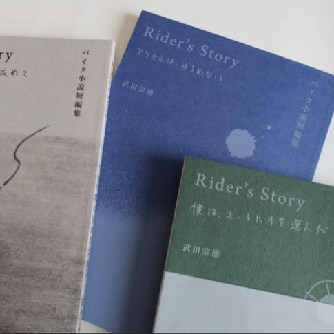 バイク雑誌や関連ウェブメディアなどにバイク短編小説やエッセイを掲載する執筆家でもある店主の著書「Rider's Story」シリーズや、ステッカーなどのオリジナルグッズも並びます。