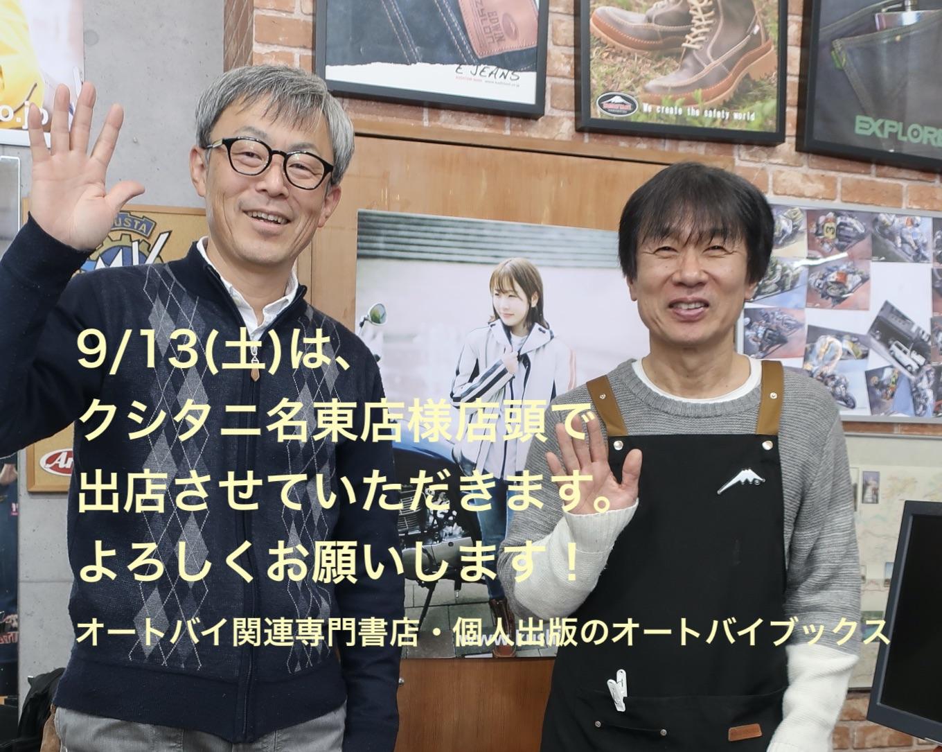 オートバイ専門書店・個人出版「オートバイブックス」の出張販売です。会場はライディングウエアメーカークシタニのプロショップ「クシタニ名古屋東店」です。
